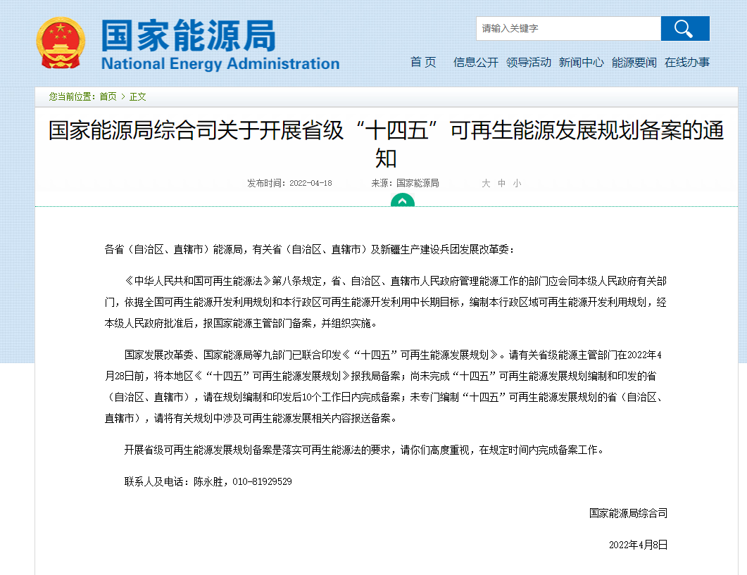國(guó)家(jiā)能(néng)源局綜合司關于開§₹÷(kāi)展省級“十四五”可(kě)再生(shēng)能 ↓®(néng)源發展規劃備案的(de)通(tōng)知(zhī)×γ↓