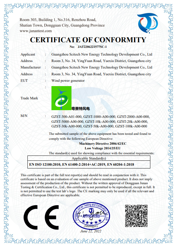 2022年(nián)6月(yuè)24日(rì),廣東艾利吉§∞≠↔新能源科技發展有限公司全系列風(fēng)機(£$jī)獲得(de)CE安全認證和(hé)全系列電(diàn)池獲得(d e)RoHS安全認證。
