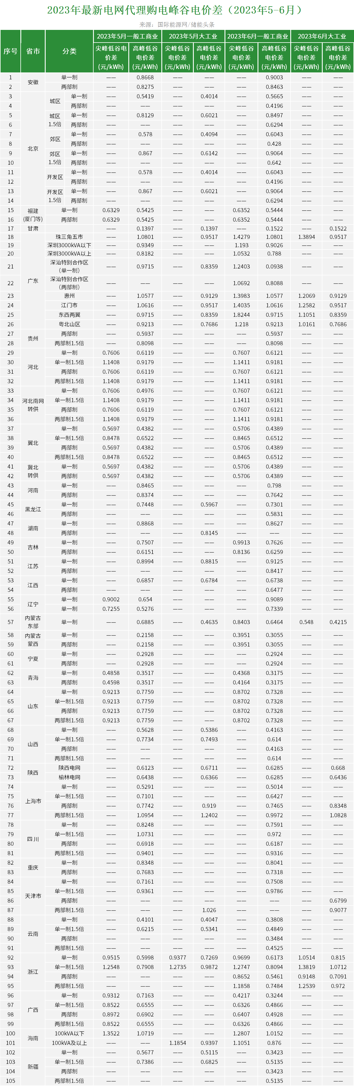 峰谷電(diàn)價差變化(huà)最大(dà©"≥)漲幅的(de)地(dì)區(qū)是(shì)內(nèi)蒙古蒙西(xī),較上(shàng)月(y≥γ$uè)增長(cháng)83%,6月(yuè)最大(dà)價差為(wèi)0.3915元/kW£☆€♥h。峰谷電(diàn)價差變化(huà)最大(dà)跌幅的(de)地(d'∑ì)區(qū)是(shì)廣西(xī),較上(shàng)月(yuè)₹®$<降低(dī)55%,6月(yuè)最大(dà)價差為(wèi)0.4217¥★≠元/kWh。6月(yuè)峰谷電(diàn)價差最大(dà)的(de)地(dì)區♦δδ♠(qū)是(shì)廣東(dōng)(珠三角五市(shì)),™♠為(wèi)1.4279元/kWh。