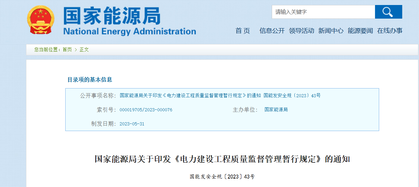 國(guó)家(jiā)能(néng)源局關于印發《電(diàn)力建設工(÷≤→λgōng)程質量監督管理(lǐ)暫行(xíng)規定》的(de↓φΩ<)通(tōng)知(zhī)國(guó)能(néng)發安全規〔2023〕43号