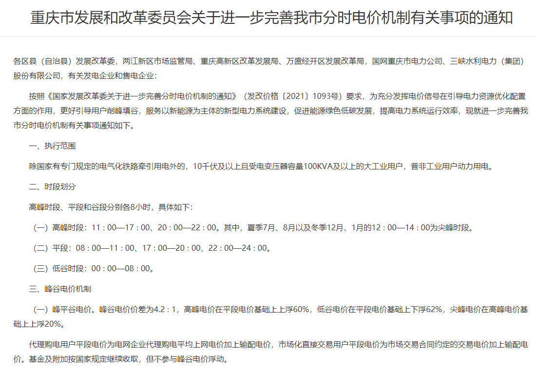 重慶市(shì)發改委發布《關于進一(yī)步完善★εα我市(shì)分(fēn)時(shí)電(diàn)價機γε(jī)制(zhì)有(yǒu)關事(shì)項的(₽'↔de)通(tōng)知(zhī)》明(míng)确,10千伏及以上(shàng)且受電(di•≠♦àn)變壓器(qì)容量100KVA及以上(shàng)的(de) δ大(dà)工(gōng)業(yè)用(yòng)戶,普α✘÷↕非工(gōng)業(yè)用(yòng)戶動力用(yòng)電(diàn)。₹₩♣峰谷電(diàn)價價差為(wèi)4.2∶1,高(gāo)峰₹φ↓電(diàn)價在平段電(diàn)價基礎上εσ(shàng)上(shàng)浮60%,低(dī)谷電(diàn)價在平段電(diàn)價基礎上(shàng)下&δ¥(xià)浮62%,尖峰電(diàn)價在高(gāo)峰電(dià β✘ n)價基礎上(shàng)上(shàng)浮20%₹♦。